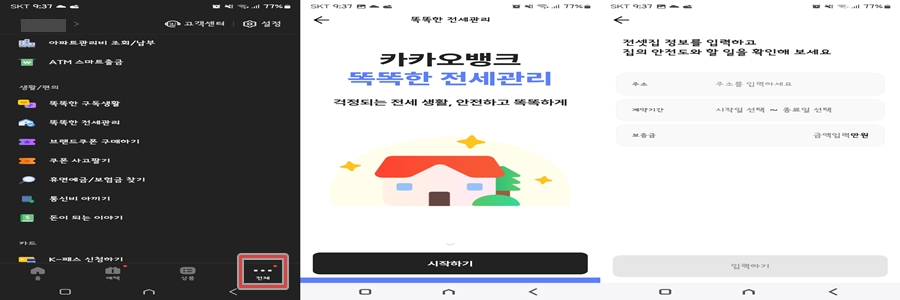 카카오뱅크를 접속해 보시면 "전체 메뉴"에서 "똑똑한 전세 관리"를 검색하고 들어가고자하는 계약 정보를 입력해 주시면 됩니다. 그러면 안전/비교적 안전/주의/주의(경고) 등의 4단계로 알기 쉽게 알려주고 외에도 집주인의 예상 보유 주택수나 상습 채무 불이행, 권리침해 사항 등의 내용까지 알 수 있습니다.