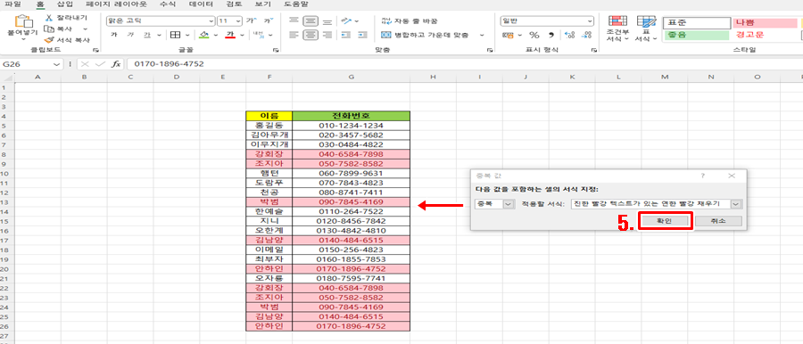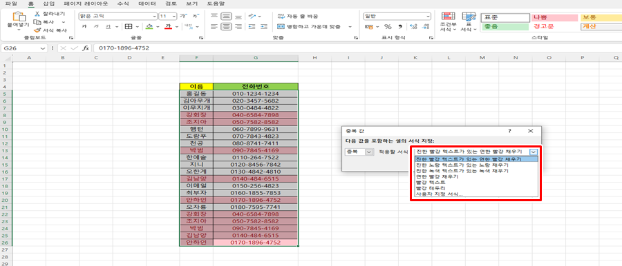 그러면 이렇게 중복값으로 된 부분이 표시가 됩니다. 너무 간단하지 않나요? 하지만 여기서 동일하게 할 수 있지만 반대의 개념으로 설정도 가능합니다.