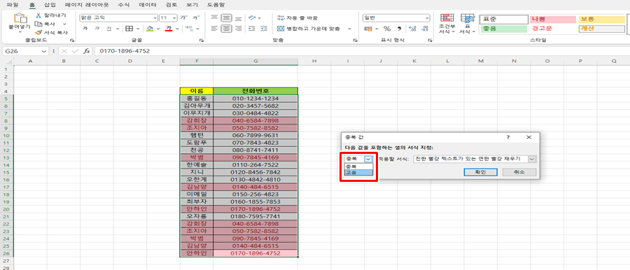 중복 값 찾는 부분에서 새롭게 열린 창에 보시면 " 중복 "이란 문구 옆에 화살표시를 눌러보면 문구가 " 중복, 고유 " 두 가지 중 한 가지를 선택할 수 있도록 되어있습니다. 이 부분을 가지고 중복이 아닌 고유만 따로 선택도 할 수 있다는 점 알고 계시면 유용할 듯합니다.