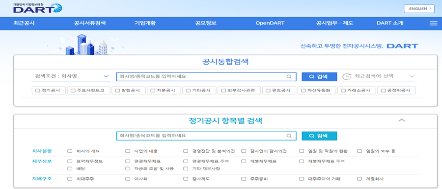 ● 금융전자공시시스템(DART) : https://dart.fss.or.kr 웹사이트 접속하신 후 검색창에 기업명 또는 종목코드(번호)를 입력 후 검색하시면 사업보고서, 연간/분기별 재무제표를 확인할 수 있습니다.