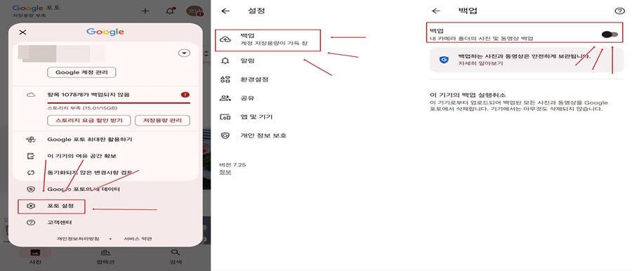 ● 기존 업로드된 사진 삭제 : 동기화를 해제해도 이미 구글 사진에 업로드된 사진은 삭제되지 않습니다. 삭제하려면 구글 사진 앱에서 수동으로 삭제해야 합니다.