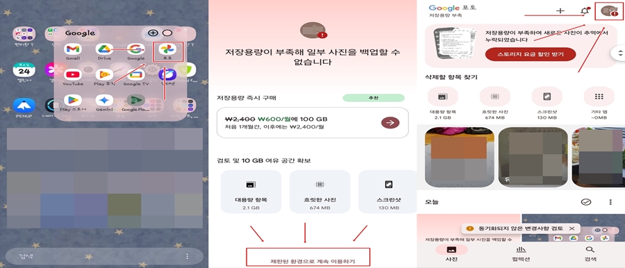 저장공간이 부족해서 돈내면 더 많은 용량 줄께 라는 부분이 보일겁니다. 하단에 "제한된 환경으로 계속 이용하기" 터치