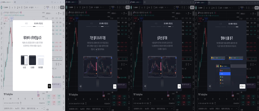그럼 이제 정상적으로 트레이딩뷰 사용이 가능하고요. 첫 사용때부터 테마, 기본멀티 지원등등 선택하거나 내용을 알려주는 팝업창이 나옵니다. 순차적으로 지나가면 이제 트레이딩뷰 무료로 사용이 가능해집니다. 혹시 여러분들게서 이 글을 보시고 트레이딩뷰 홈페이지를 접속할것같으니 싸이트 연동될수 있도록 하단에 만들어 놓겠습니다.
