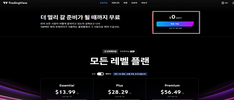 하단에 모든 레벨 플랜 문구는 버리시고 오른쪽 상단 "회원가입" 문구가 있습니다.클릭 또는 터치해주세요.