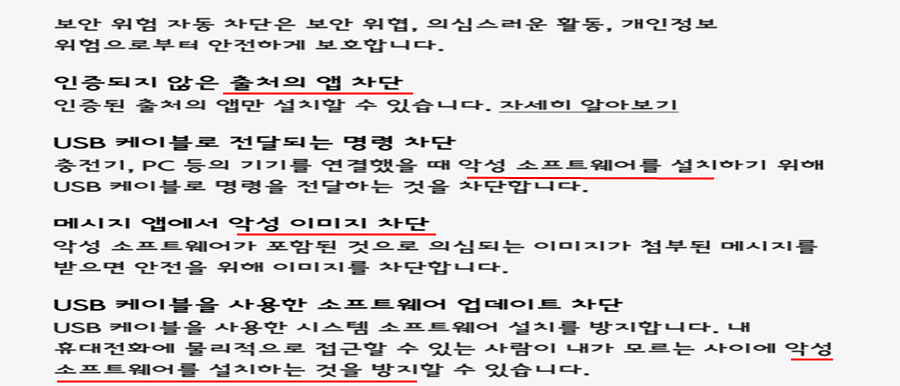 ※ 이 기능은 삼성에서 15년만에 추가한 기능입니다. 이 기능을 활성화 했을 시 인증되지 않은 출처의 앱 차단, 기기 연결시 악성 소프트웨어 설치 차단, 메시지 악성 이미지 차단, 악성 소프트웨어 설치 방지를 할 수 있습니다.