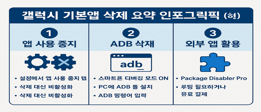 | 항목 | 사용 중지 | ADB 삭제 | 외부 앱 활용 |